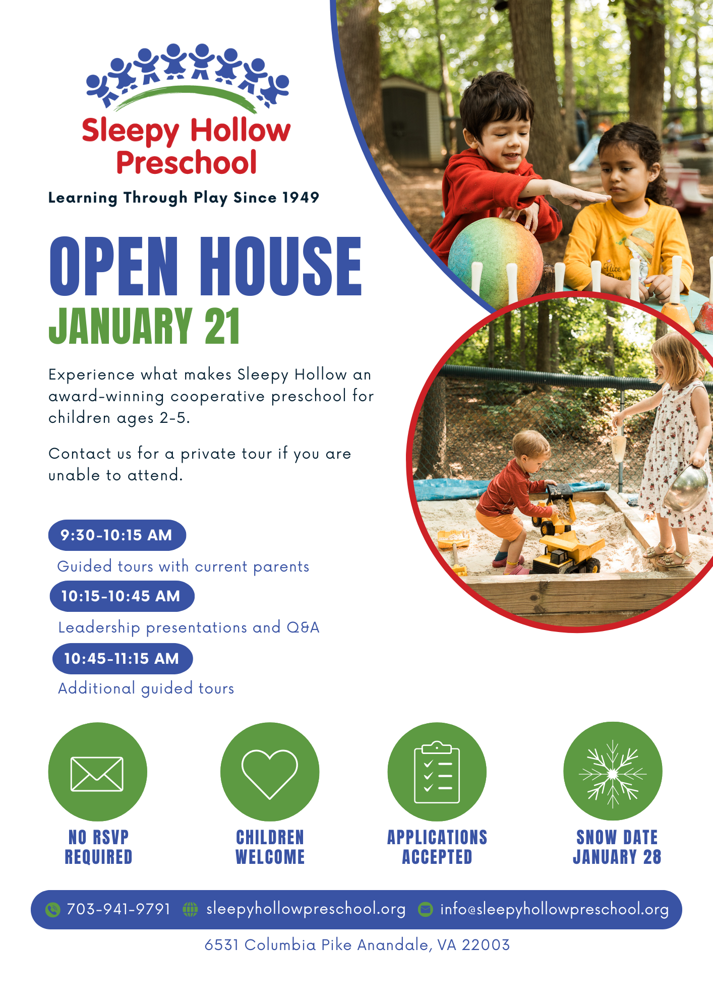 You're invited to our annual OPEN HOUSE on Wednesday, January 21, 2026 @ 9:30 a.m. Guided tours with current parents will be followed by an info session with the director. No RSVP necessary and children are welcome to attend. Applications will be accepted for the 2026-27 school year. We look forward to seeing you there!