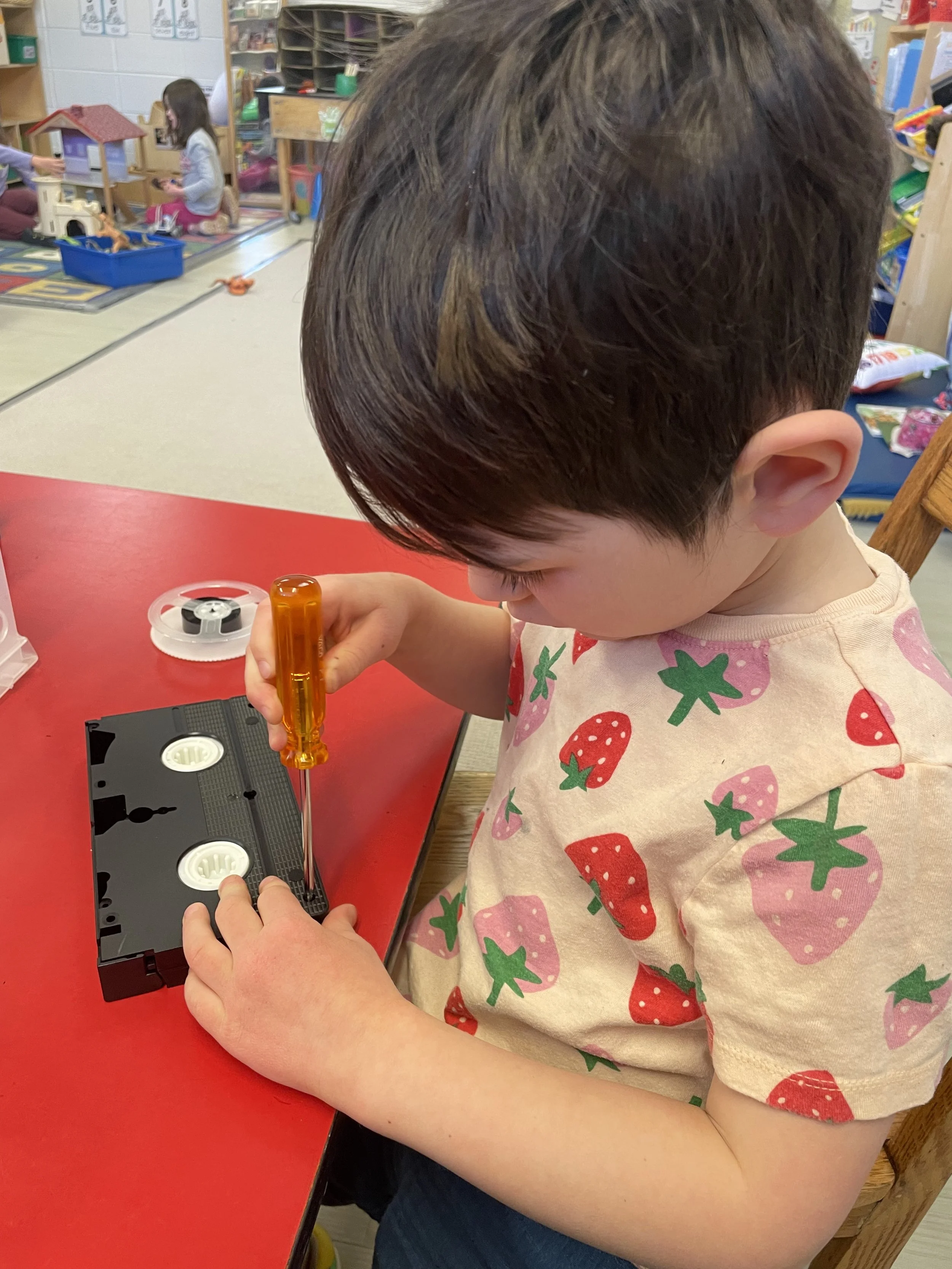 The school morning for four (and three) year-olds is balanced between outside play time, “home base” time, and “open center” time.