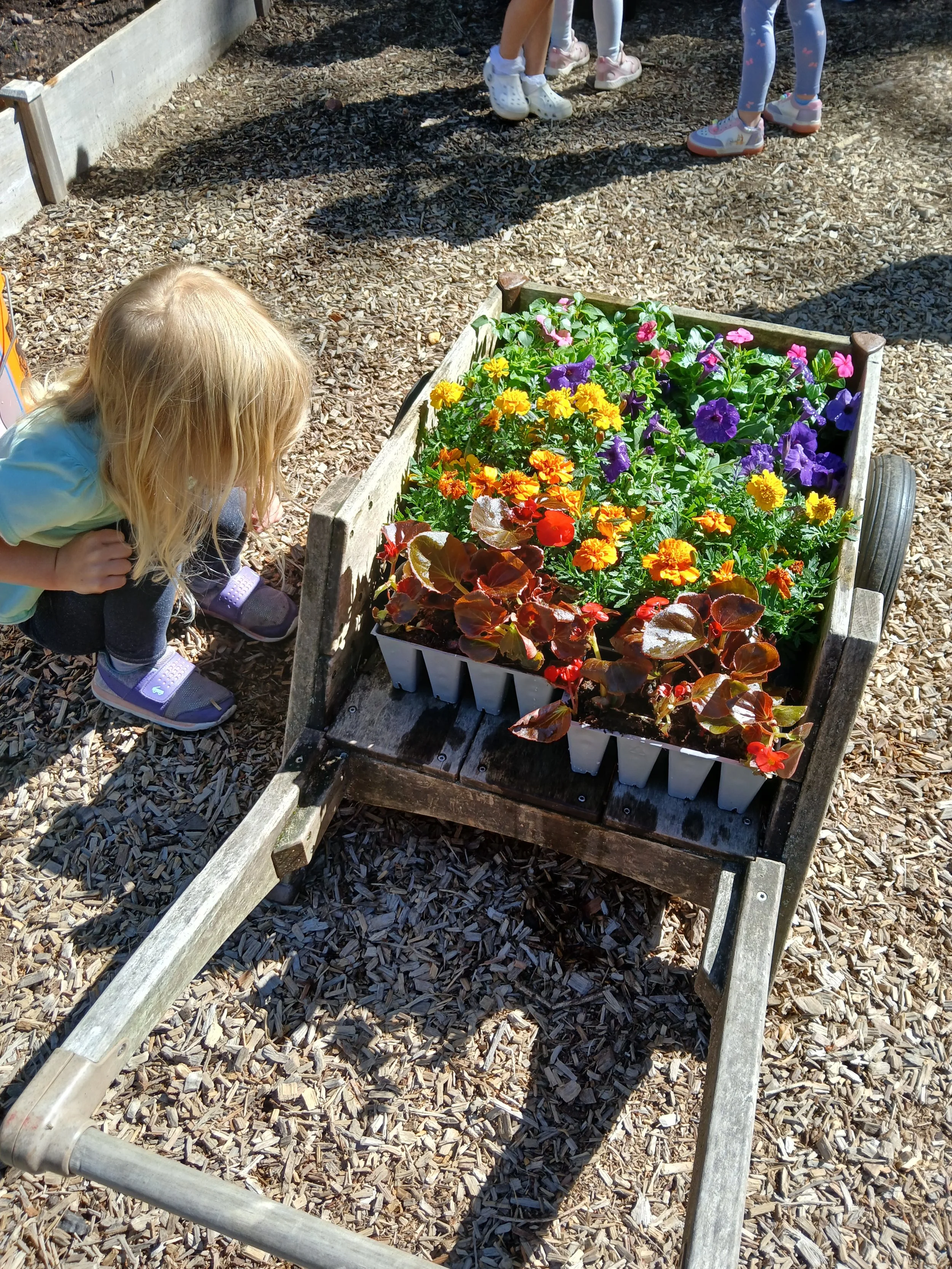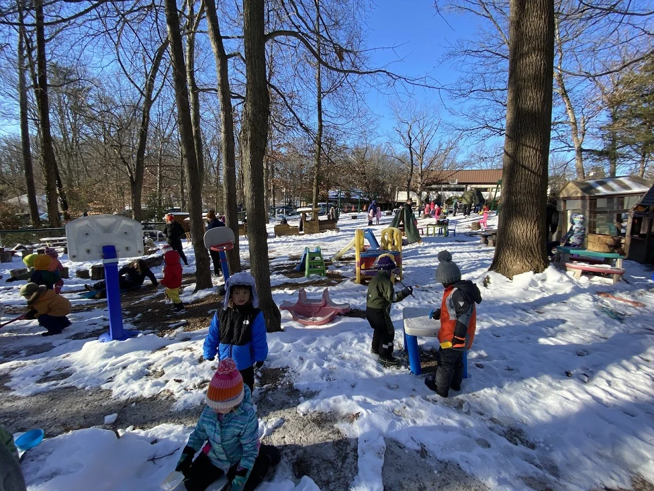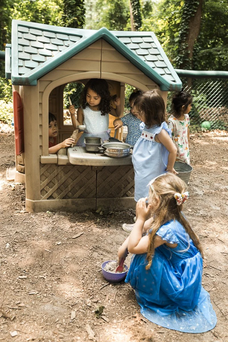 All three and four year old classes join together on our natural, expansive playground daily. The facility contains a wide array of equipment including age-appropriate structures, sandbox, bikes, and art easels. On most days, a variety of art supplies are available on the playground for quiet creative play. On some days, other teacher-inspired games or activities, such as nature exploration, are offered.