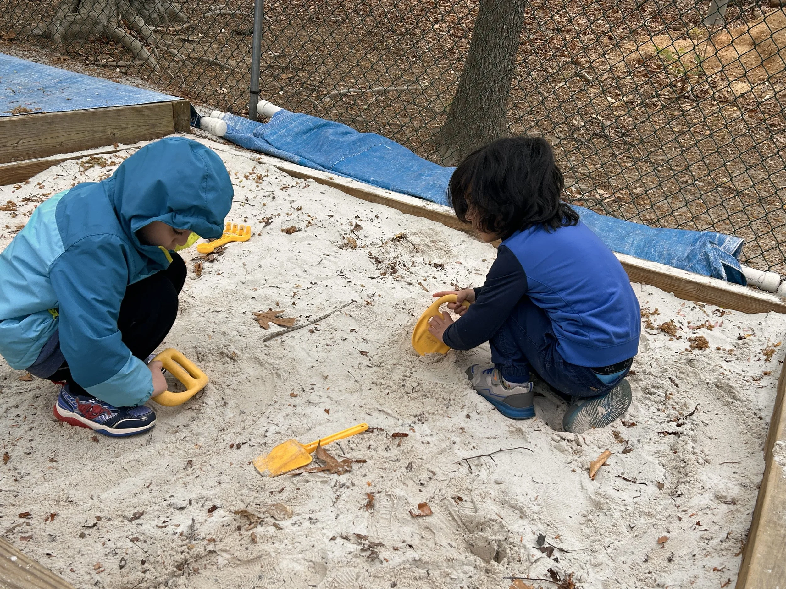 All three and four year-old classes join together on our natural, expansive playground daily. The facility contains a wide array of equipment including age-appropriate structures, sandbox, bikes, and art easels. On most days, a variety of art supplies are available on the playground for quiet creative play. On some days, other teacher-inspired games or activities, such as nature exploration, are offered.