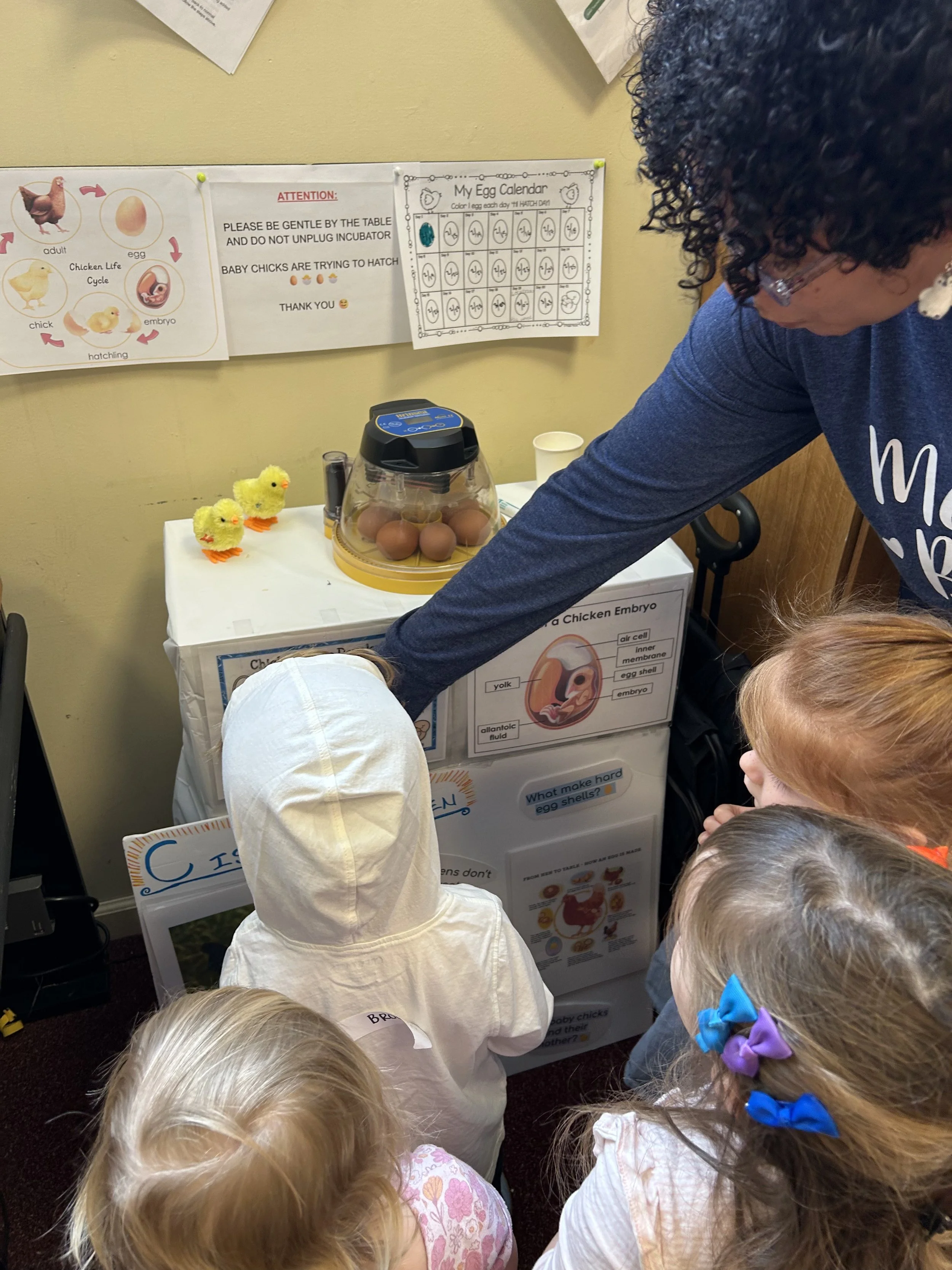 A very special time of year is when the chick eggs arrive at school! While the eggs incubate, children learn all about the life cycle of a chicken and count the days until this chicks will hatch. Holding a chick is something many children will remember for a long time!